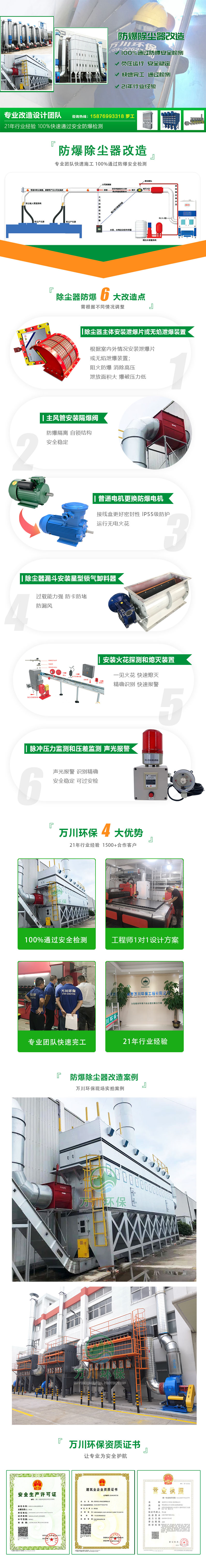 簡(jiǎn)介:專為除塵器進(jìn)行防爆改造,更安全更放心,100%通過安全防爆檢測(cè),6大防爆改造(需根據(jù)不同情況調(diào)整),快速完工助力企業(yè)快速通過安全檢測(cè)