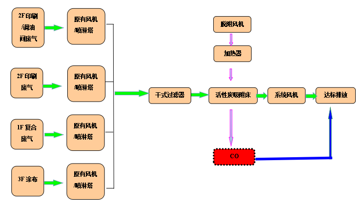 根據該公司的要求及我司有機廢氣的治理經驗,采用干式過濾、活性炭吸附處理有機廢氣,活性炭吸附飽和以后采用CO催化氧化裝置對其進行脫附。