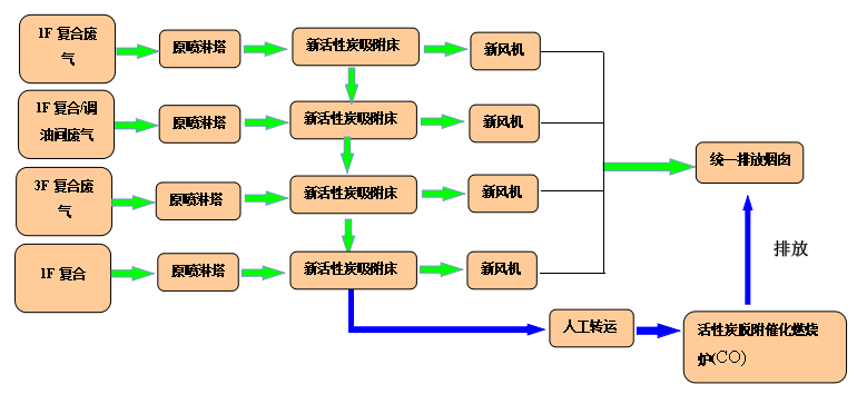 1F和3F的廢氣濃度較低,(根據檢測報告,部分排氣口濃度接近達標或已達標)在保留原有的噴淋塔情況下,各新上一套活性炭吸附塔,處理風量為10000m3/h,然后另設計一套催化燃燒(CO)進行離線脫附和再生活性炭。(4套活性炭塔共用一套離線催化燃燒設備進行離線脫附)