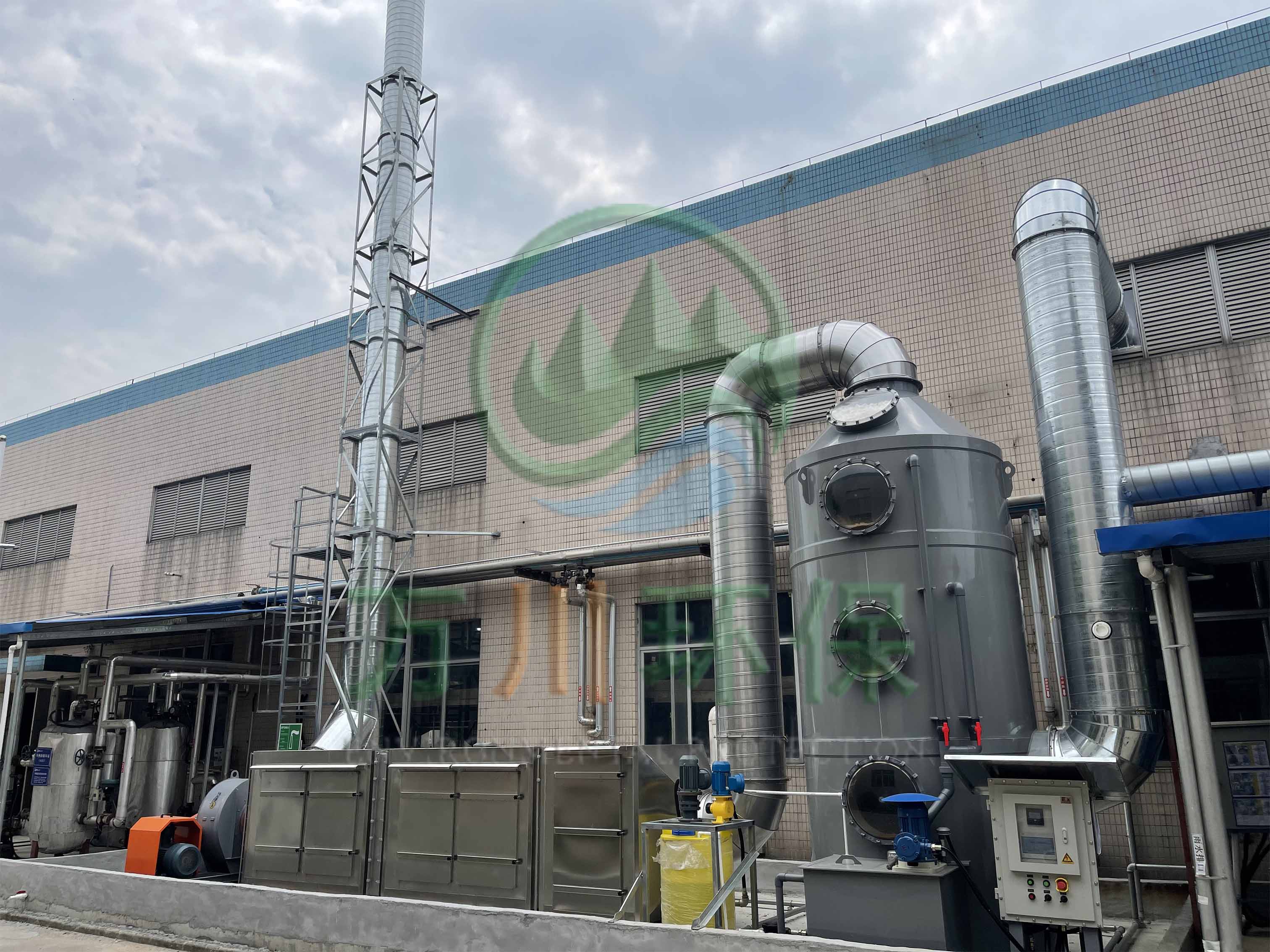根據(jù)廢氣類型和場(chǎng)地需求我們采用噴淋塔+兩級(jí)活性炭對(duì)其進(jìn)行處理。反應(yīng)釜廢氣處理配套一臺(tái)17170風(fēng)量pp噴淋塔+兩臺(tái)17170風(fēng)量的不銹鋼材質(zhì)活性炭吸附塔+干式過(guò)濾與大功率防爆離心風(fēng)機(jī)+自動(dòng)化電控柜系統(tǒng)。