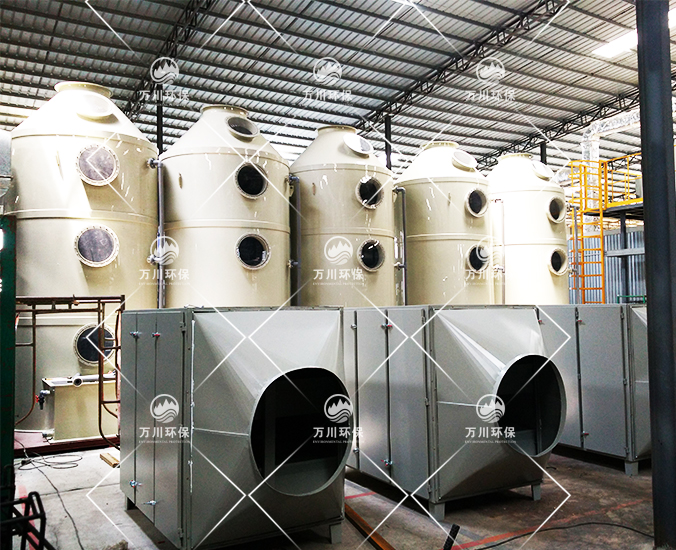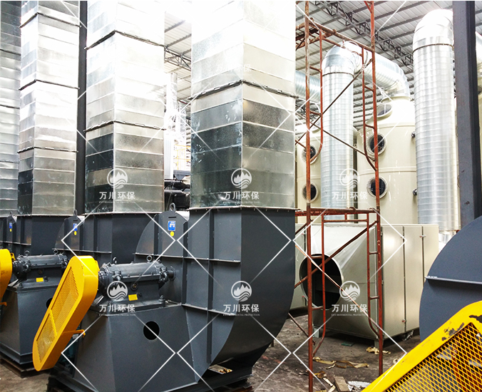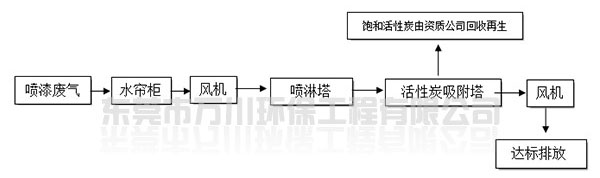 根據(jù)廠方提供的資料及現(xiàn)場(chǎng)勘察的情況。其噴漆廢氣的來(lái)源主要為無(wú)塵噴漆車間內(nèi)的5條自動(dòng)噴涂線。在生產(chǎn)過(guò)程中有噴漆,該工序產(chǎn)生了一定量含三苯有機(jī)廢氣和噴漆粉塵,該廢氣不僅對(duì)環(huán)境造成污染,而且對(duì)人體有較大的危害作用,同時(shí)也破壞了周邊的環(huán)境,造成了不良的影響,需進(jìn)行處理后排放。我們工程師分析了該廢氣的特點(diǎn)和以往的案例經(jīng)驗(yàn),采用了“水簾柜+噴淋塔+活性炭吸附塔”這套解決方案。