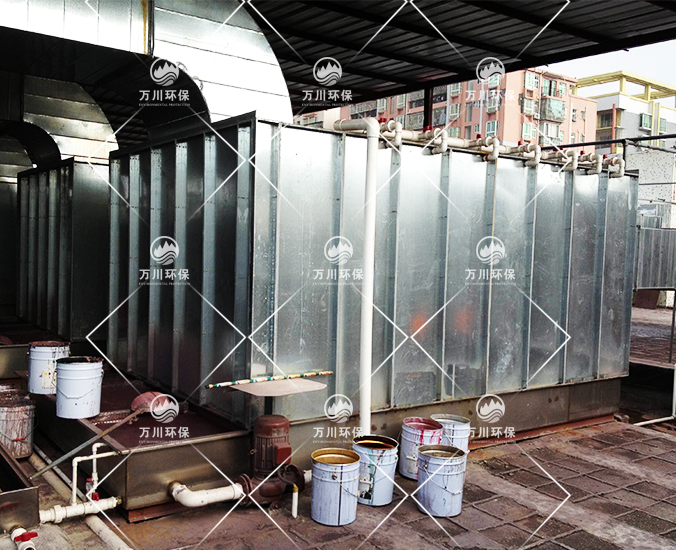 均勻安裝多層濕簾層和過濾層。水性過濾棉,不吸水,漆粉附著表面時,會隨水流受重力作用被洗滌至循環(huán)水池,不易堵。濕簾層經(jīng)水洗后會在面上形成一層水膜,漆粉經(jīng)過該層被水膜黏附,對降低氣體流速,加長廢氣在噴淋塔的洗滌時間有重要作用。廢氣經(jīng)過除霧層(即氣水分離)后,再進(jìn)行活性炭吸附塔吸附。該法具有處理效果高,運(yùn)行穩(wěn)定優(yōu)點(diǎn)。